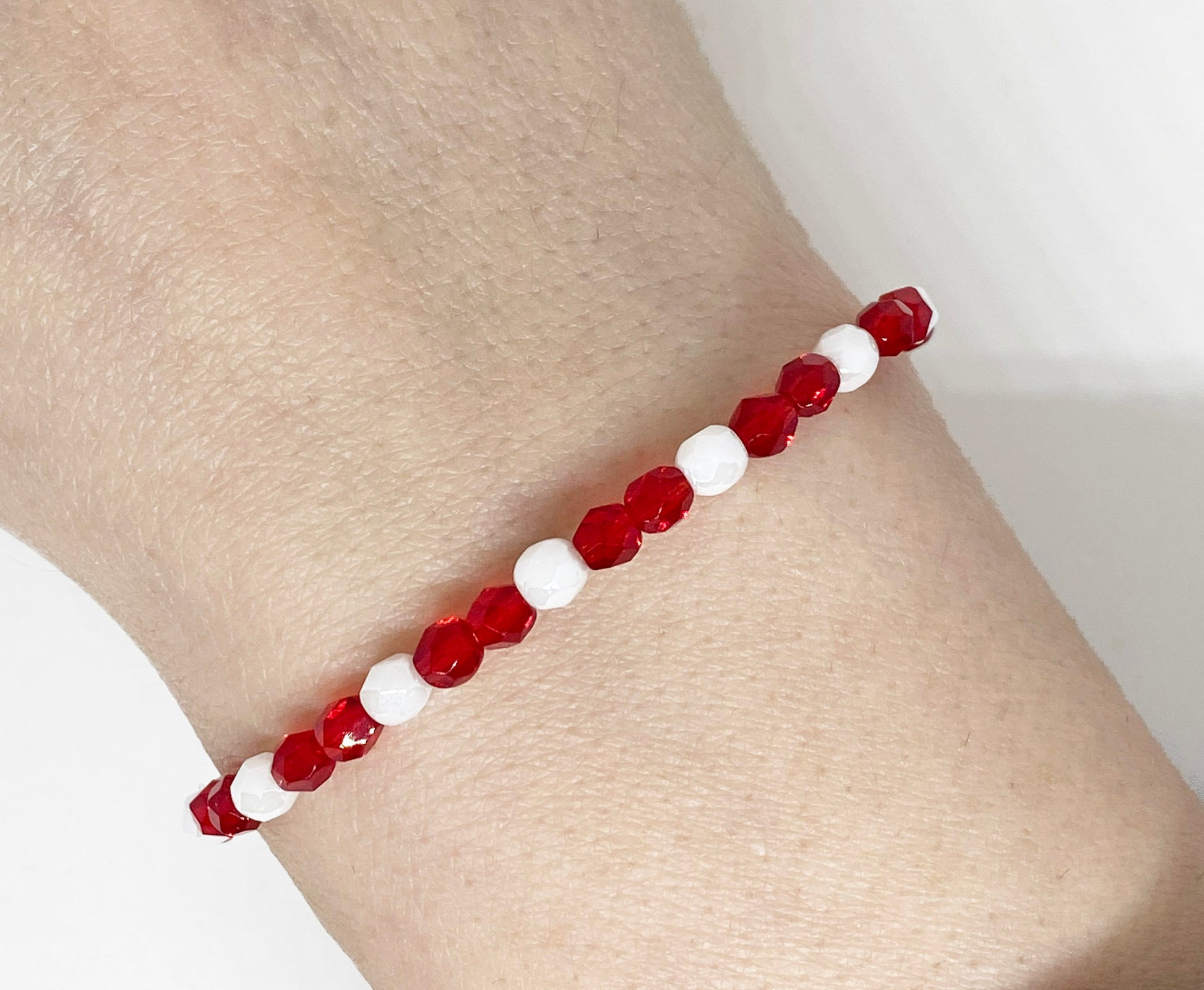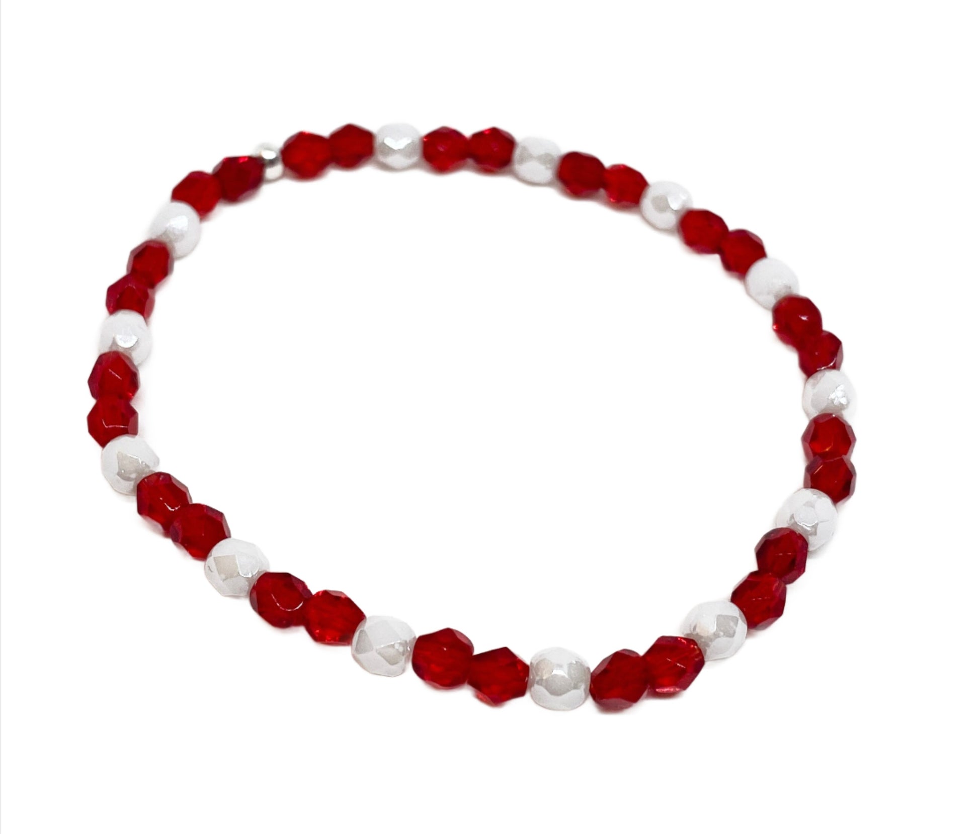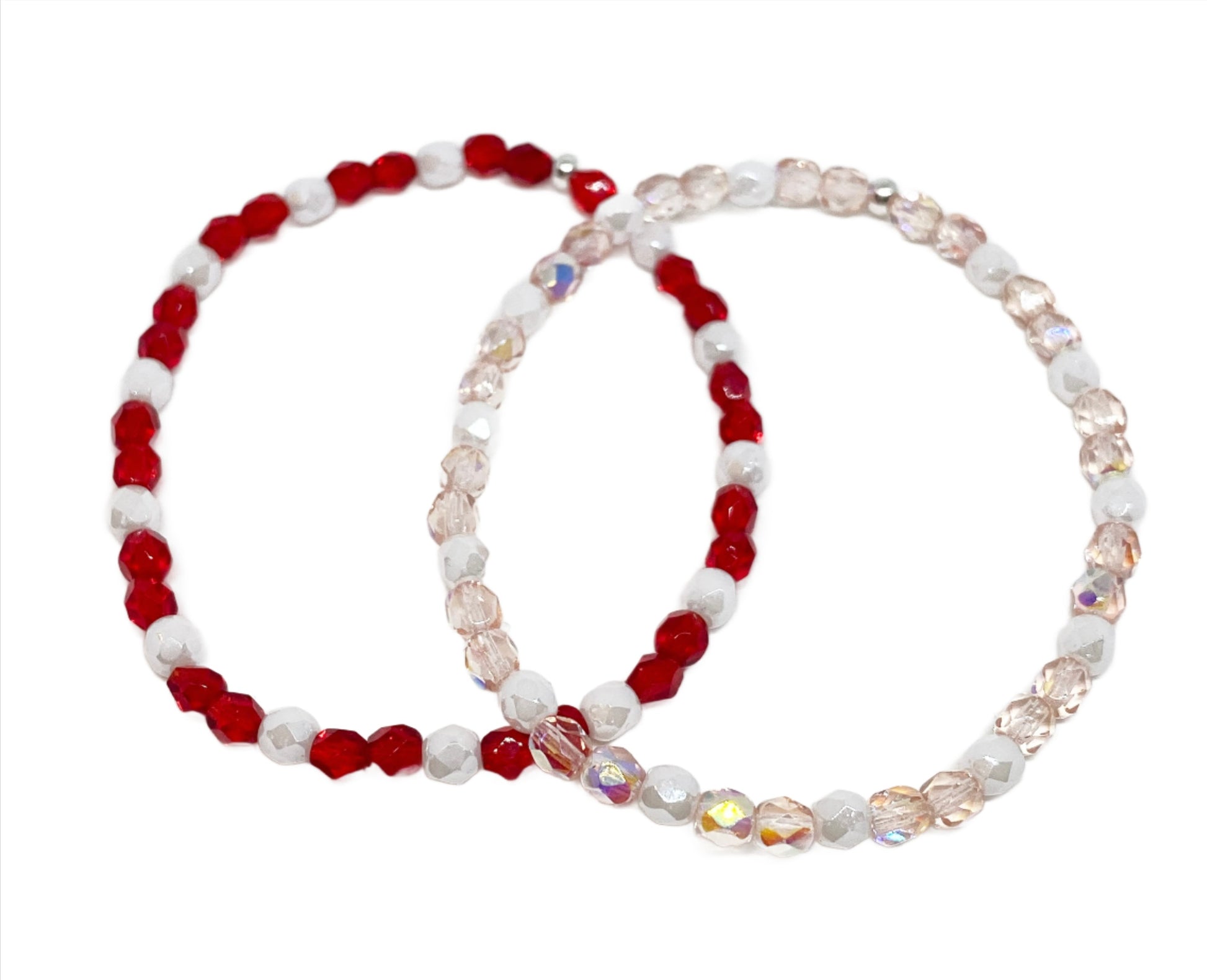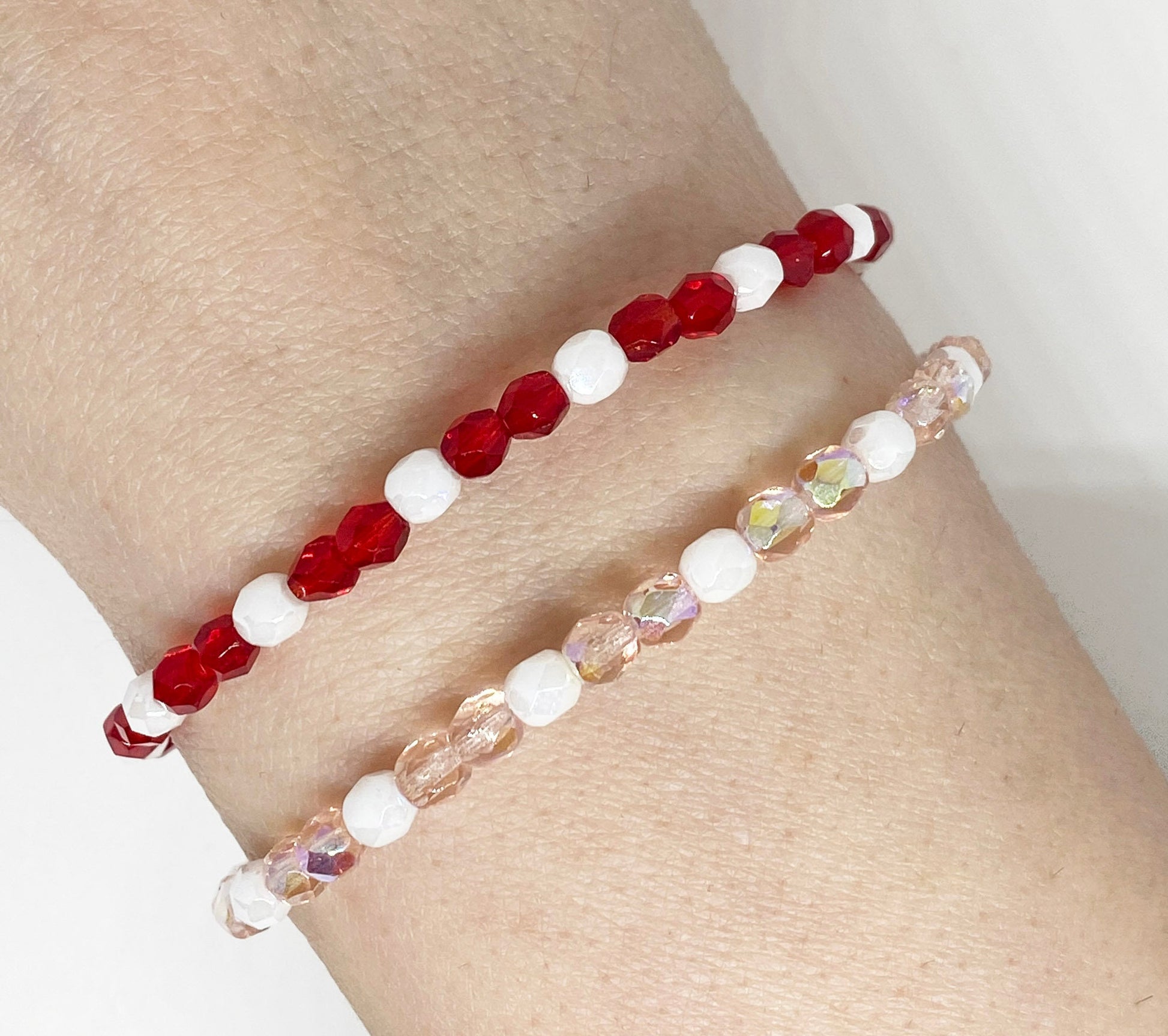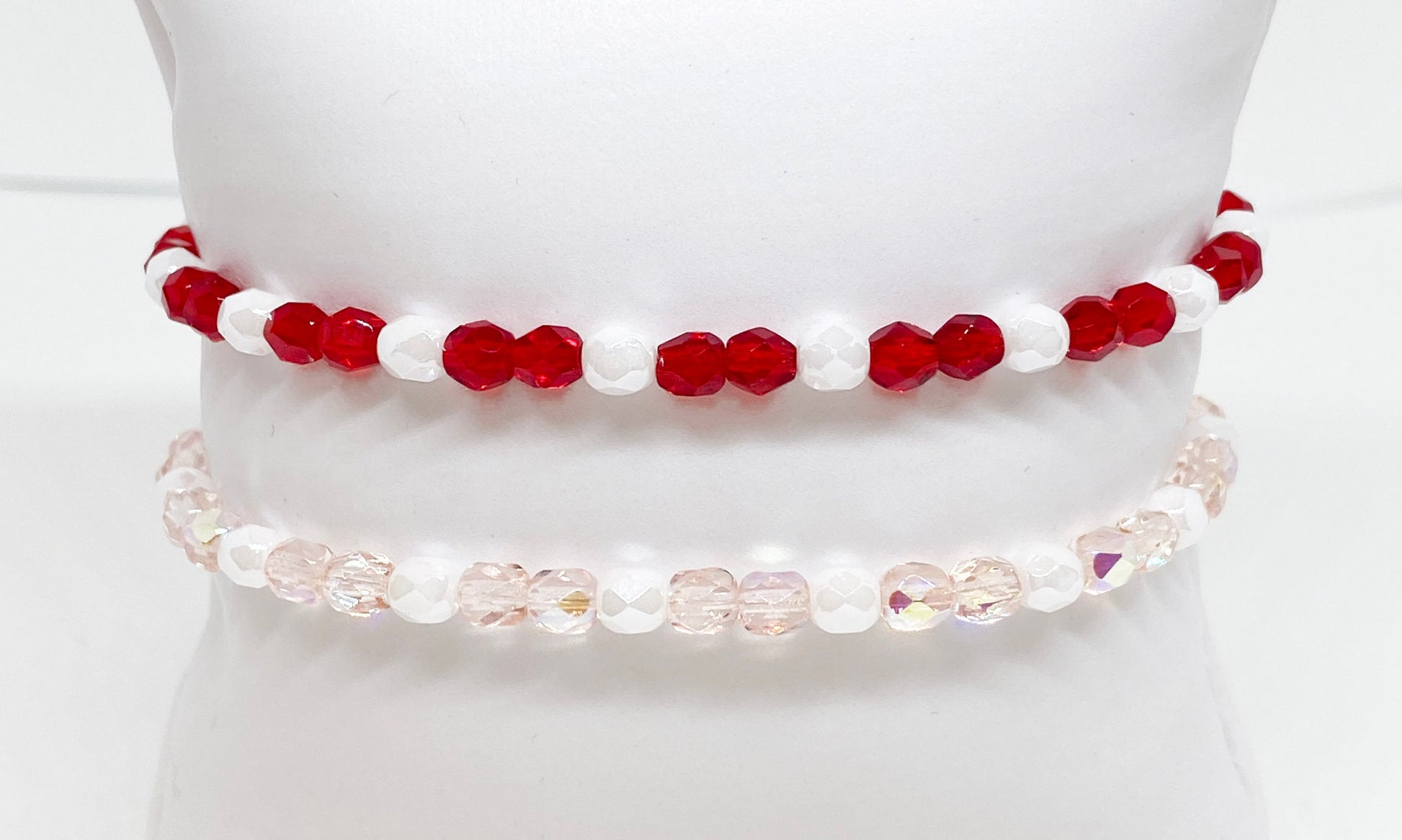 4mm Czech Glass Beads alternate on stretch cording for comfort. Choose between Red/White or Rose/White for the absolute perfect accent to you Valentine's collection!