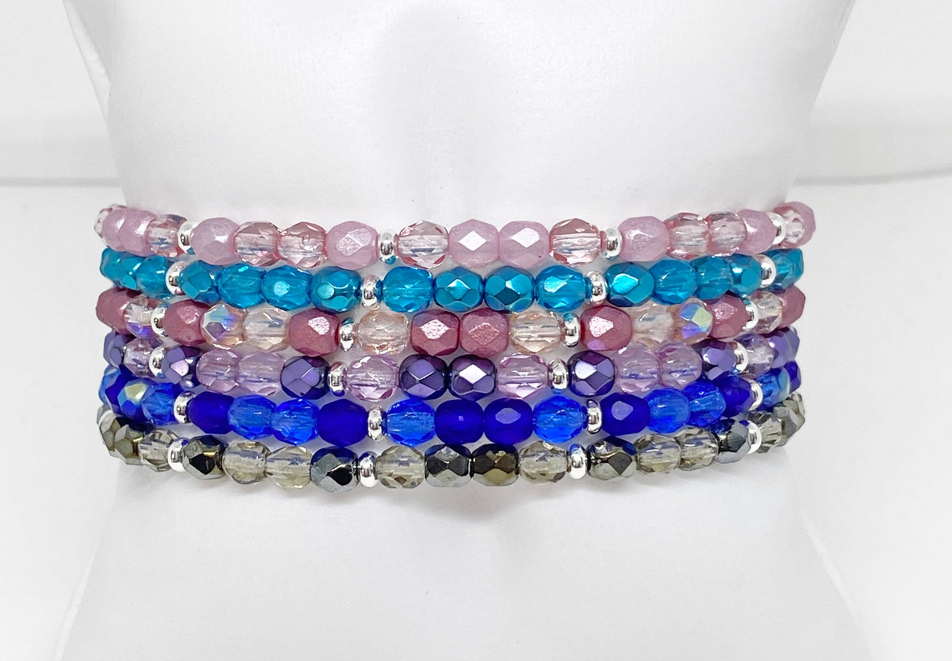 Czech Fire Polished Glass Bead Bracelet in Pink, Aqua, Purple, Blue, and Gray