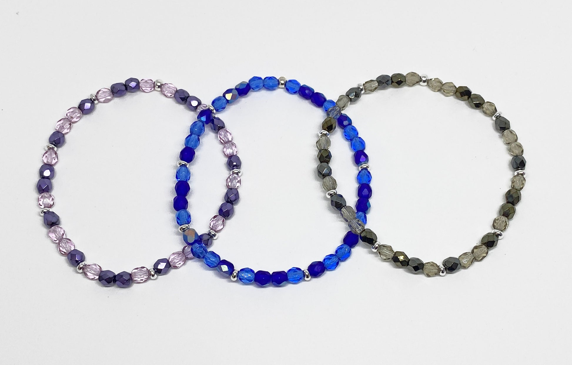 4mm oval faceted glass beads alternate between silver plated rondelles on stretch cording. The Glass beads are a mixture of matte metallic and translucent for a unique look!