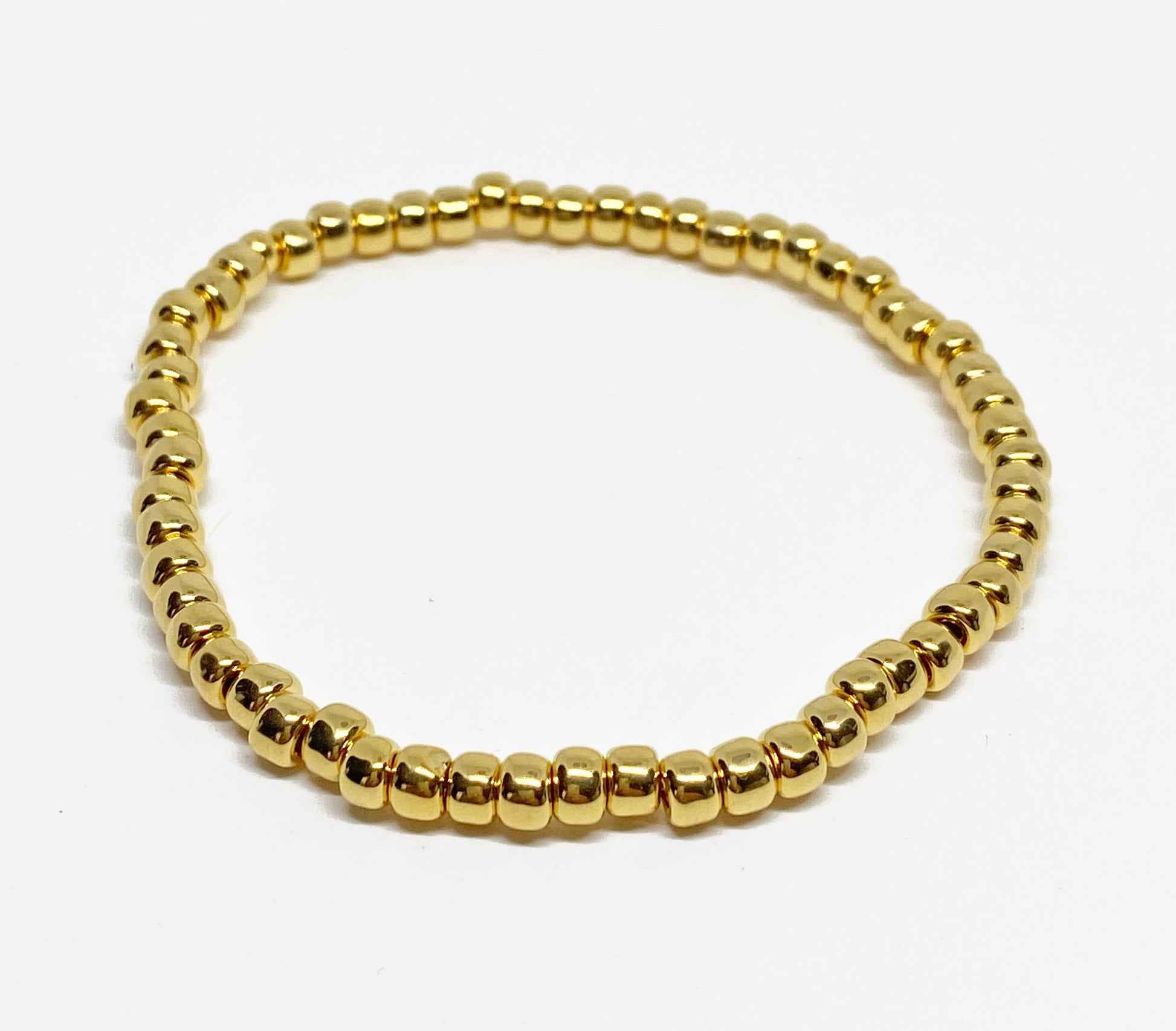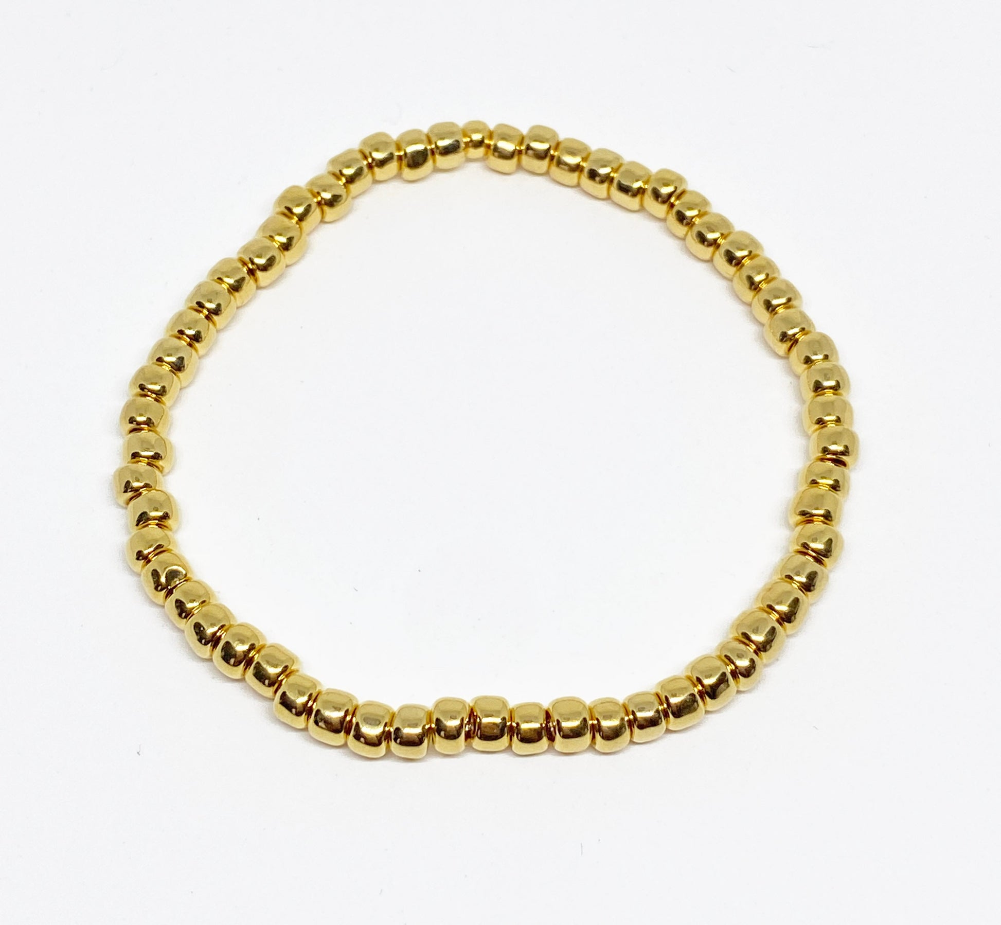 Shiny 24k gold colored glass seed beads are strung on Stretch Cording. Simple yet elegant, and the perfect addition to your bracelet stack!