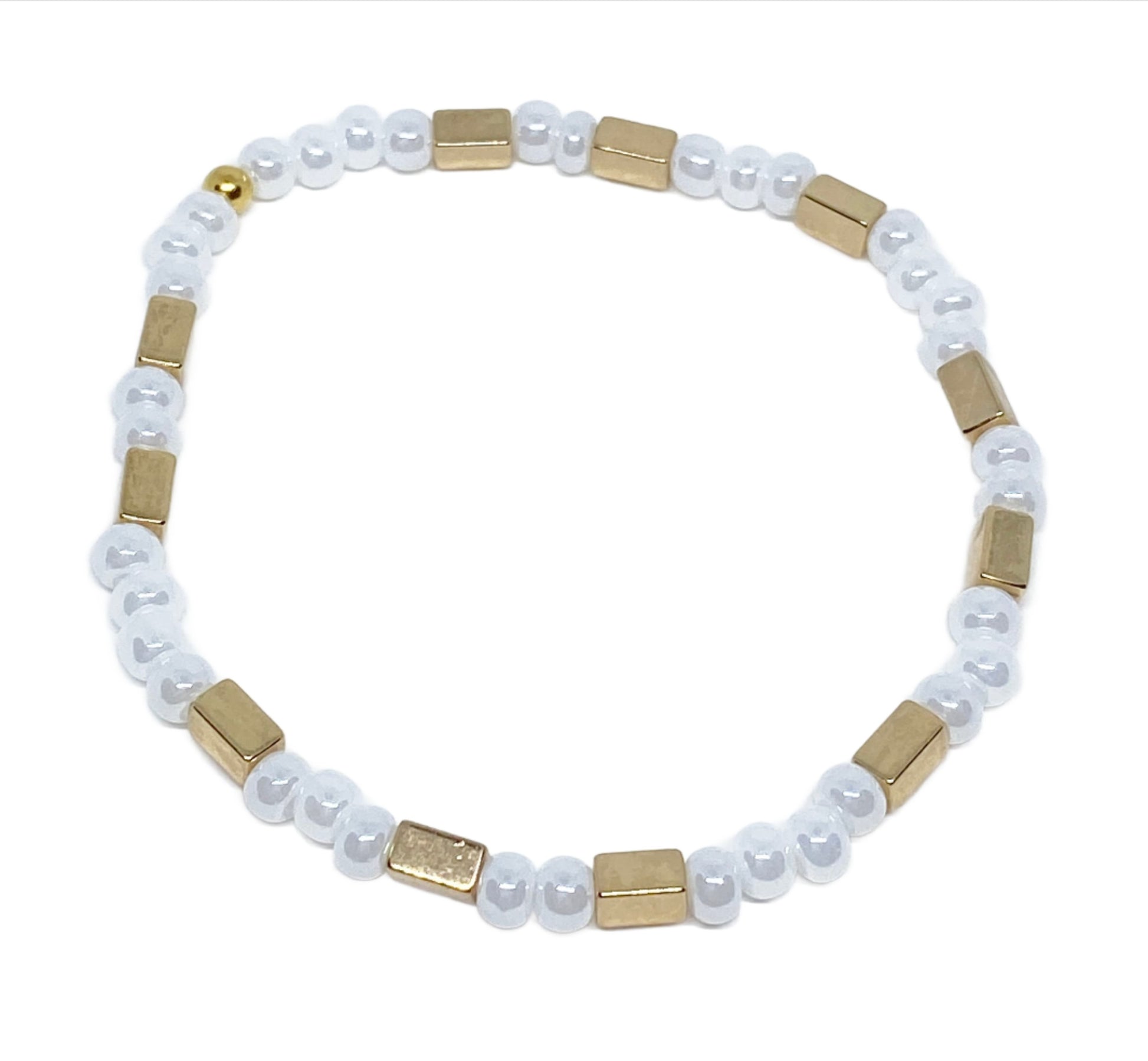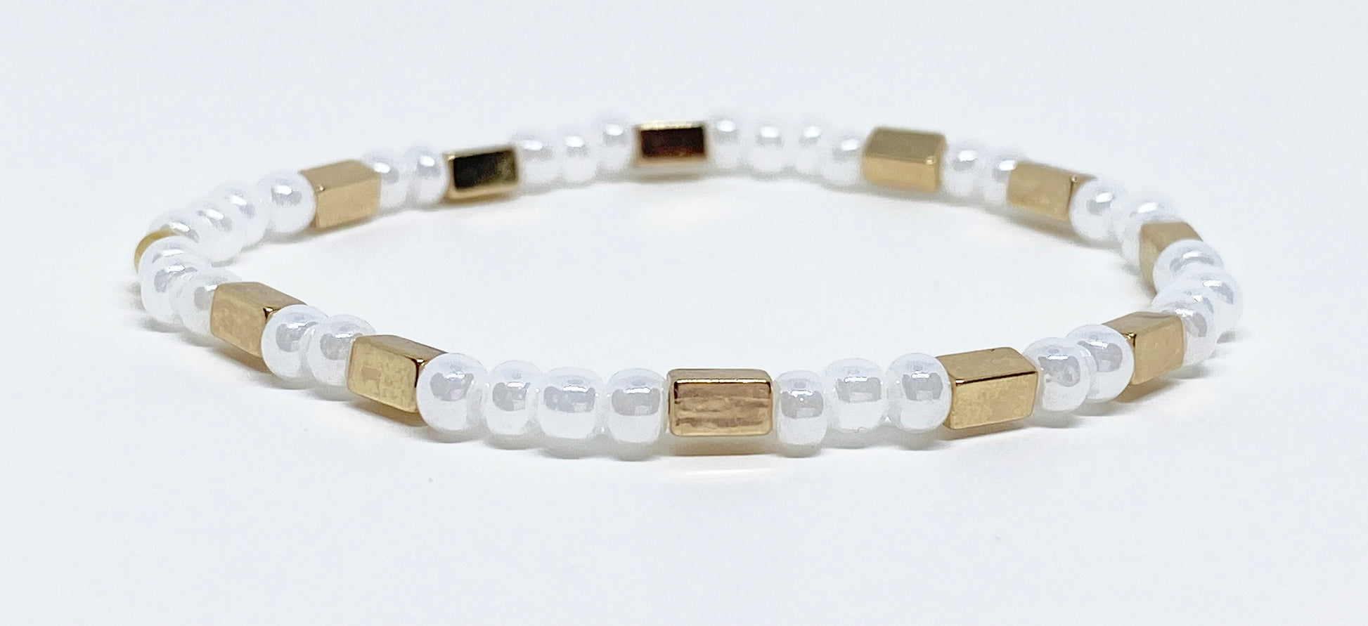 White luster glass seed beads with pearl-look finish are paired with gold plated hematite square beads on Stretch Cording. Simple yet elegant!