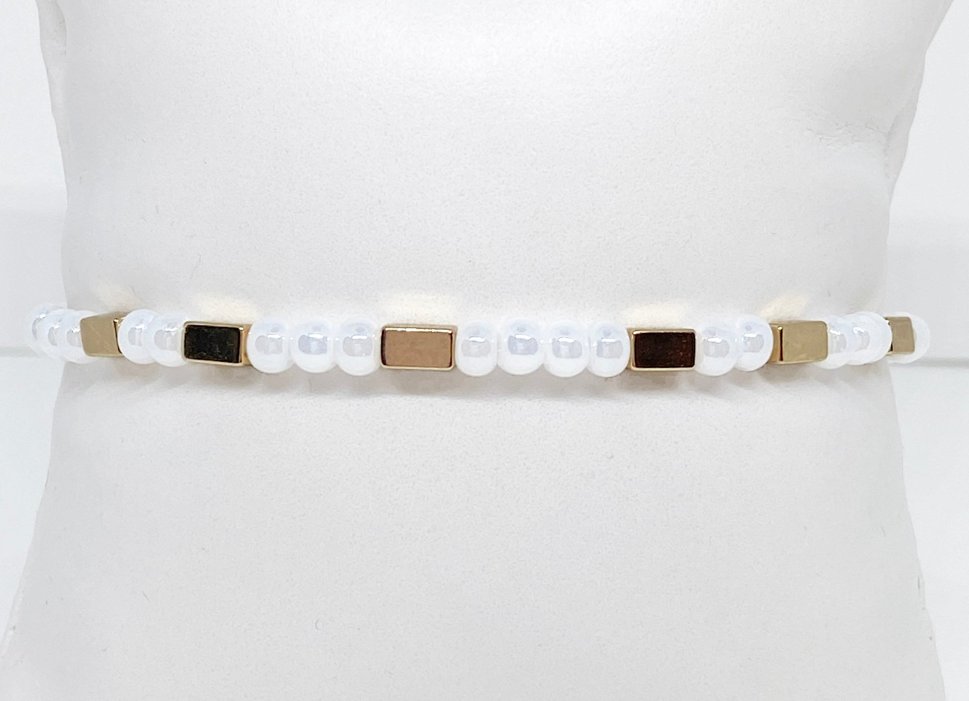 Glass Beaded Stretch Bracelet in White Luster "Pearl" with Gold Plated Hematite Square Beads