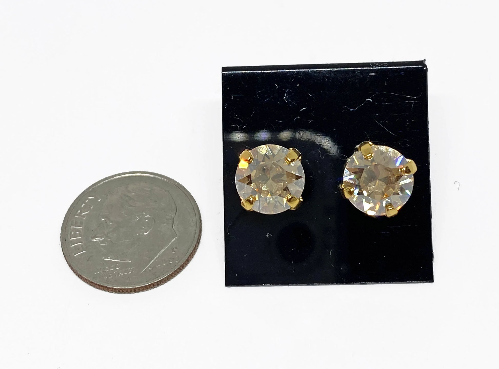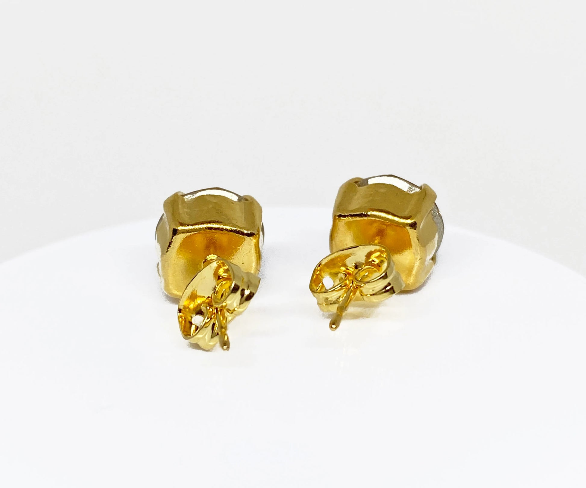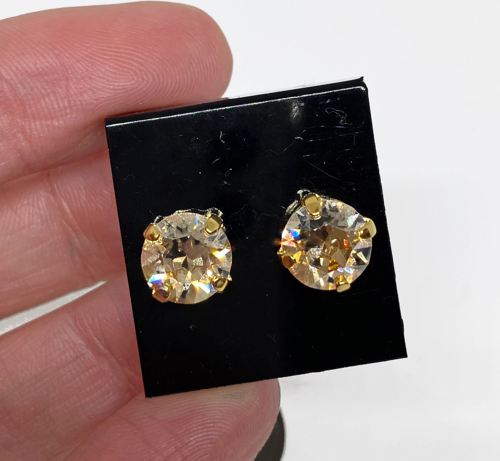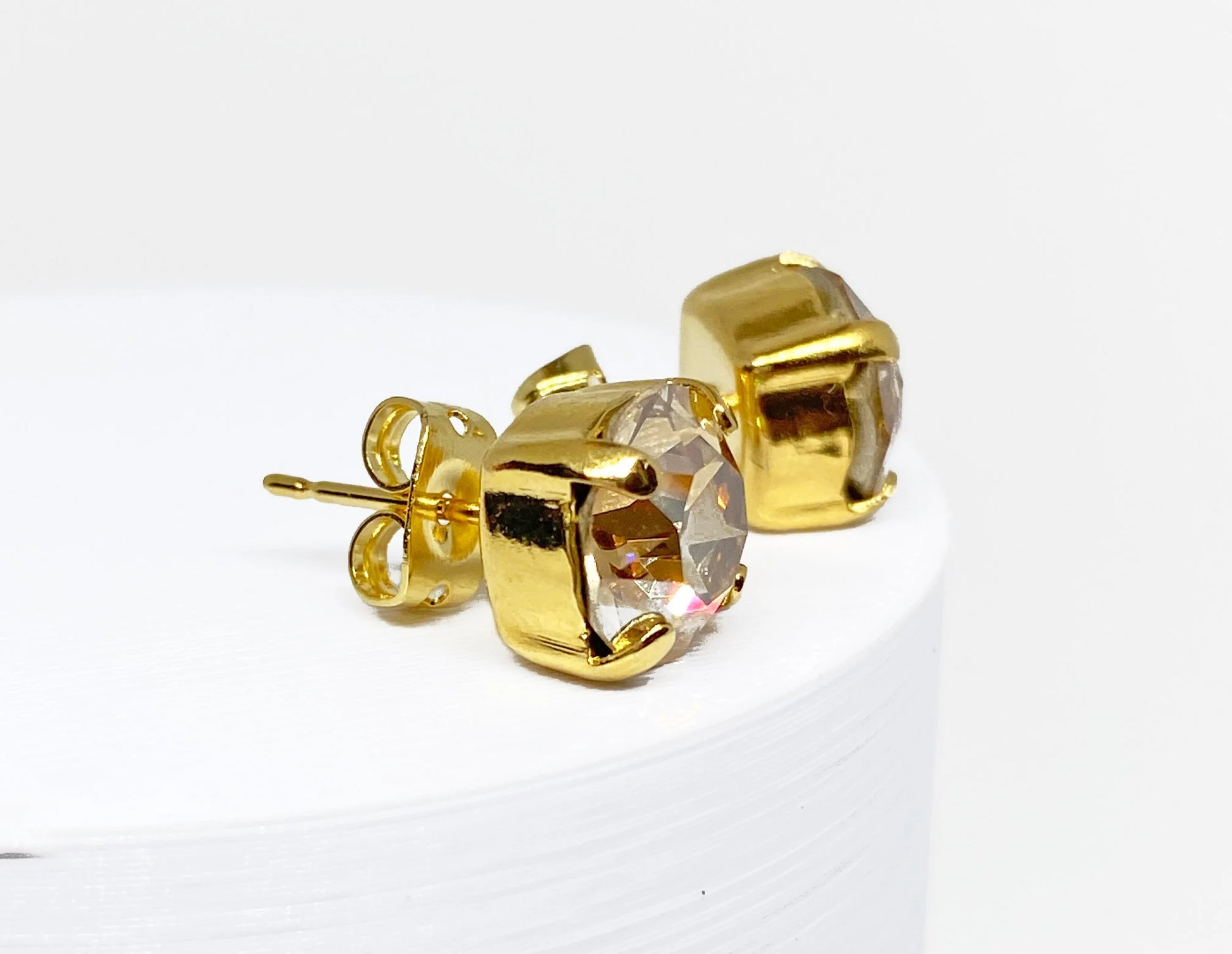 8mm Swarovski Crystal Chatons are set in gold plated brass settings. 4 prongs hold each crystal in place for the most stunning studs! Push back closure for easy on.