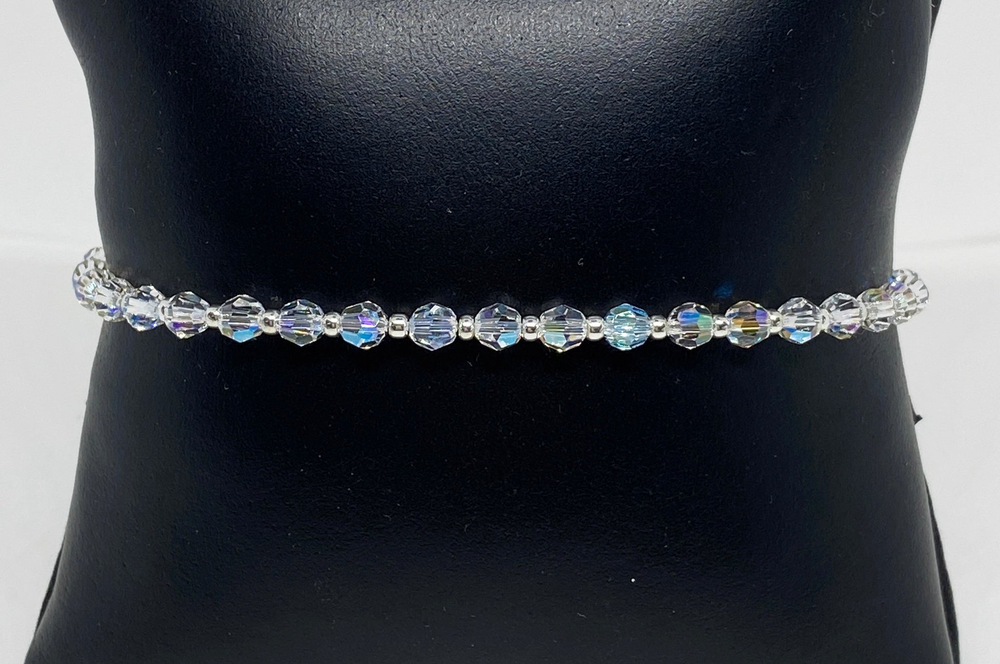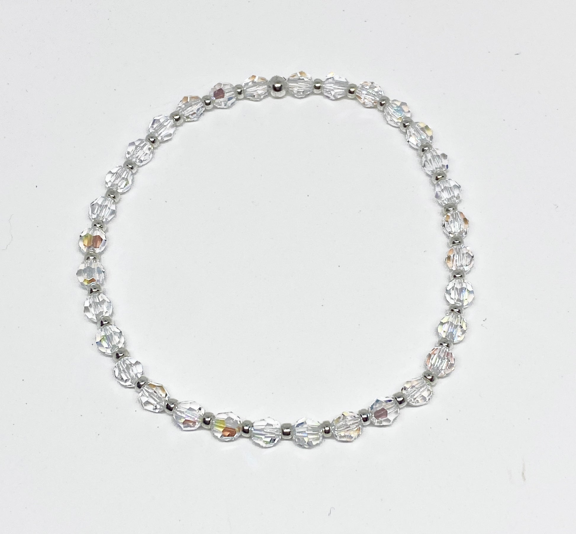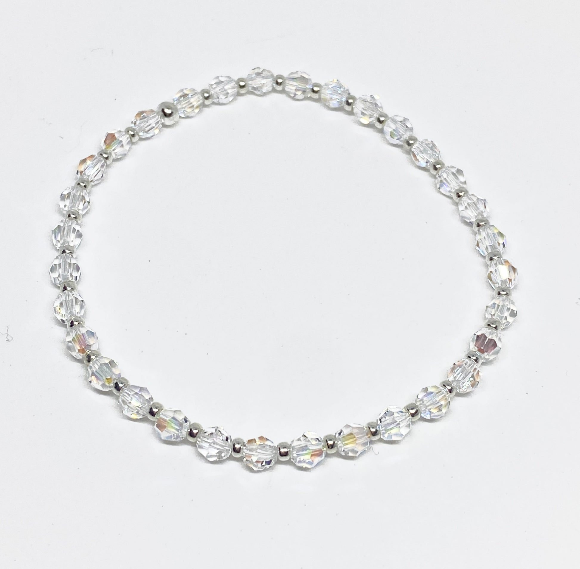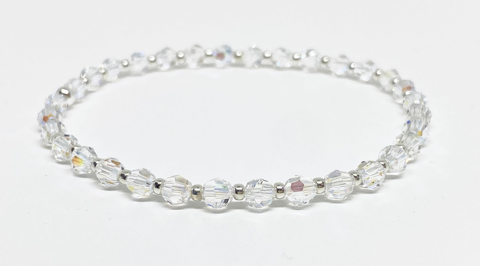 4mm Crystal Shimmer Swarovski Crystals alternate on stretch cording between mini silver seed beads for the most incredibly sparkle. The shimmer coating on these crystals reflect a rainbow of light at different angle.