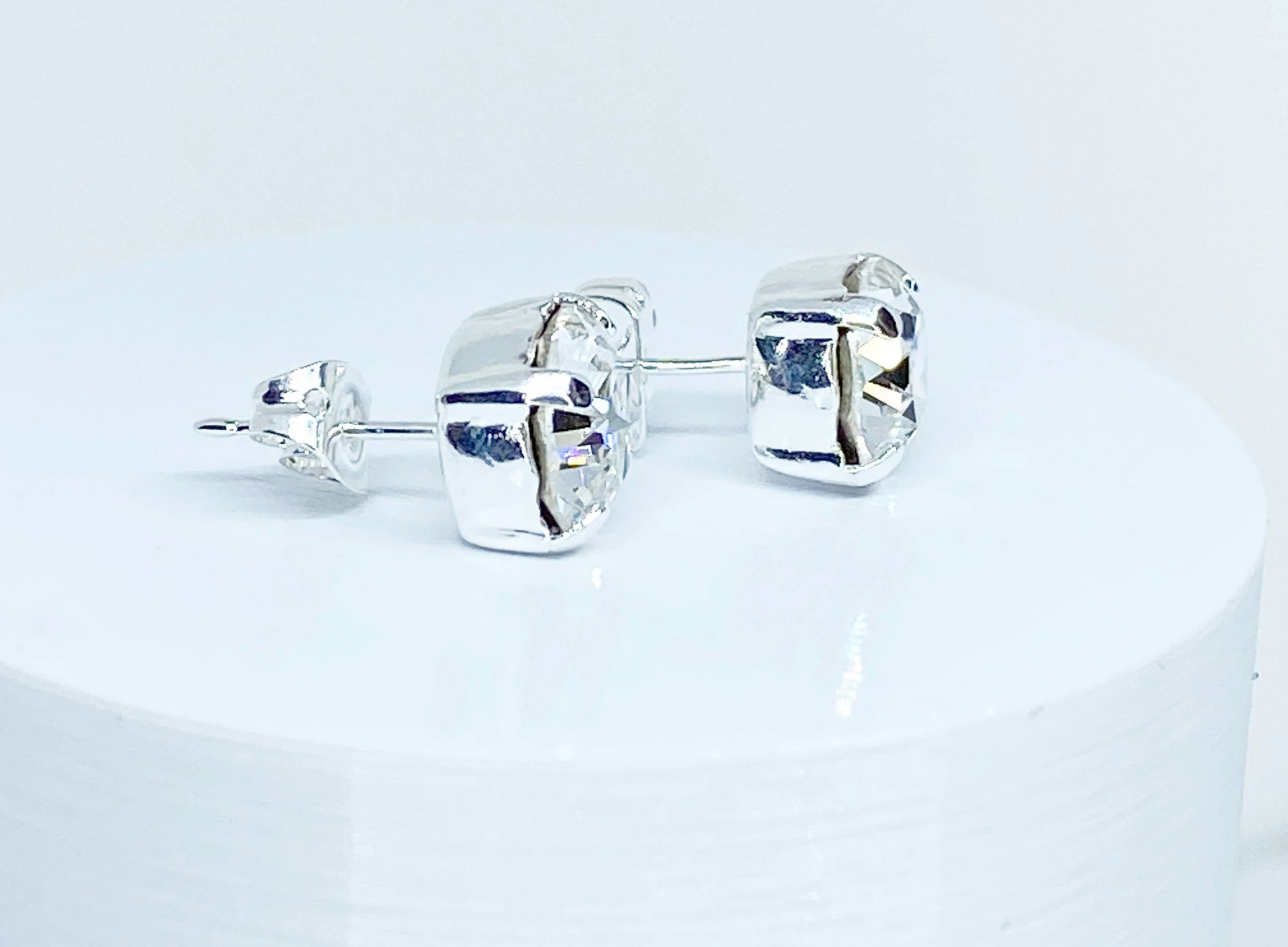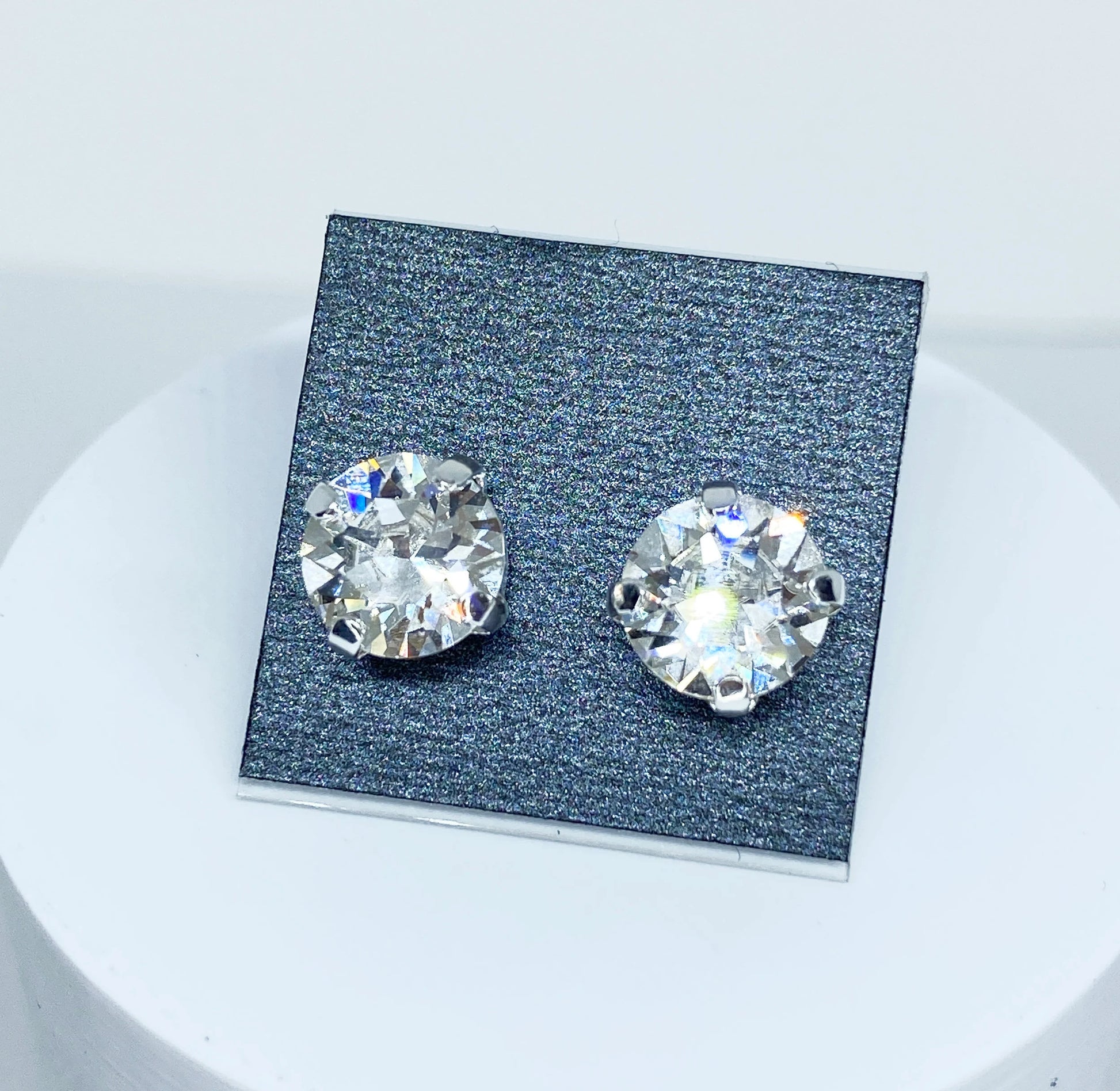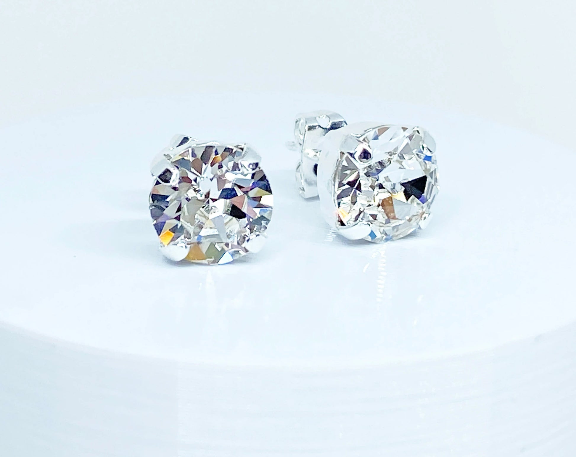 8mm Swarovski Crystal Chatons are set in Silver plated brass settings. 4 prongs hold each crystal in place for the most stunning studs! Push back closure for easy on.