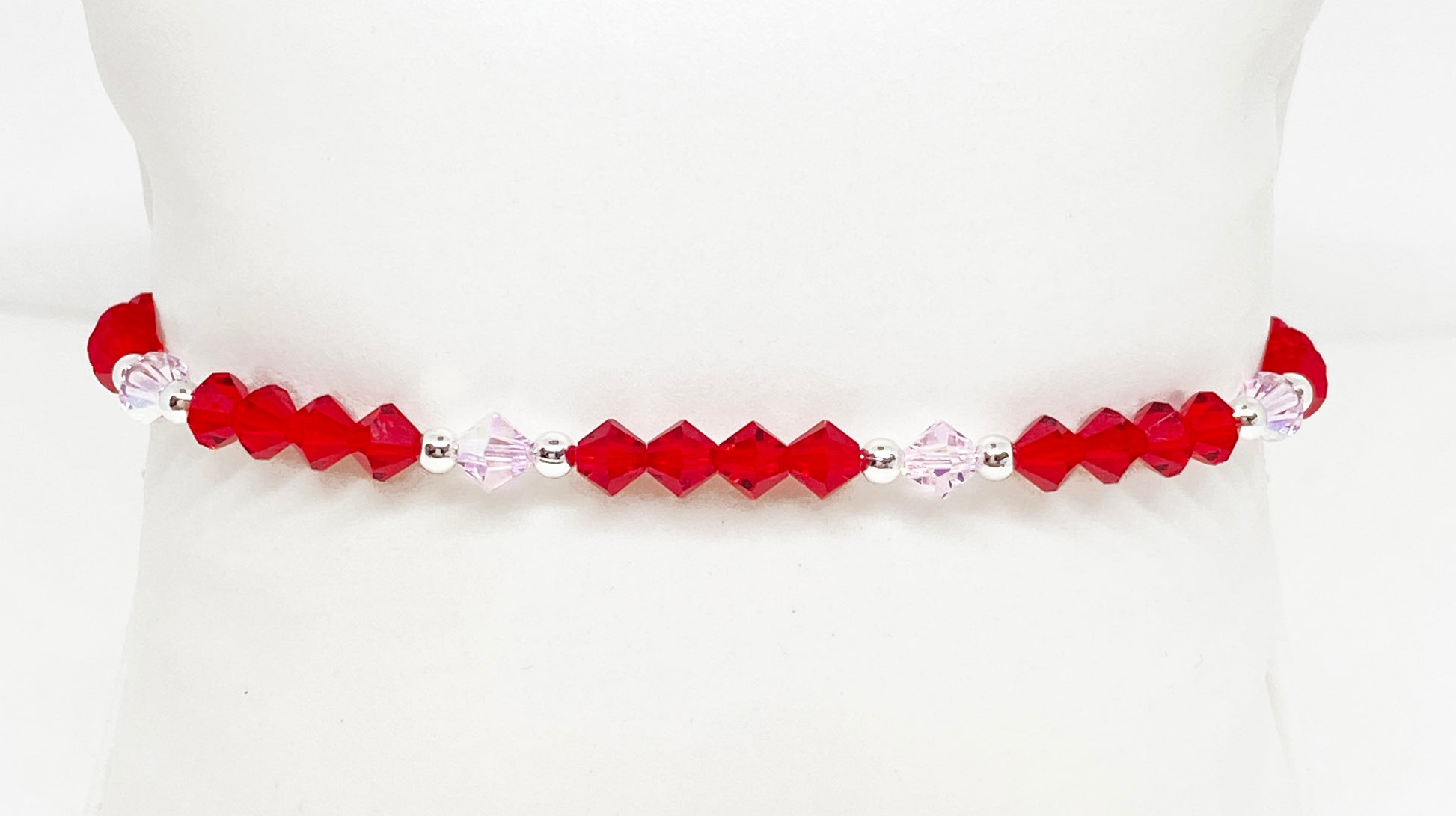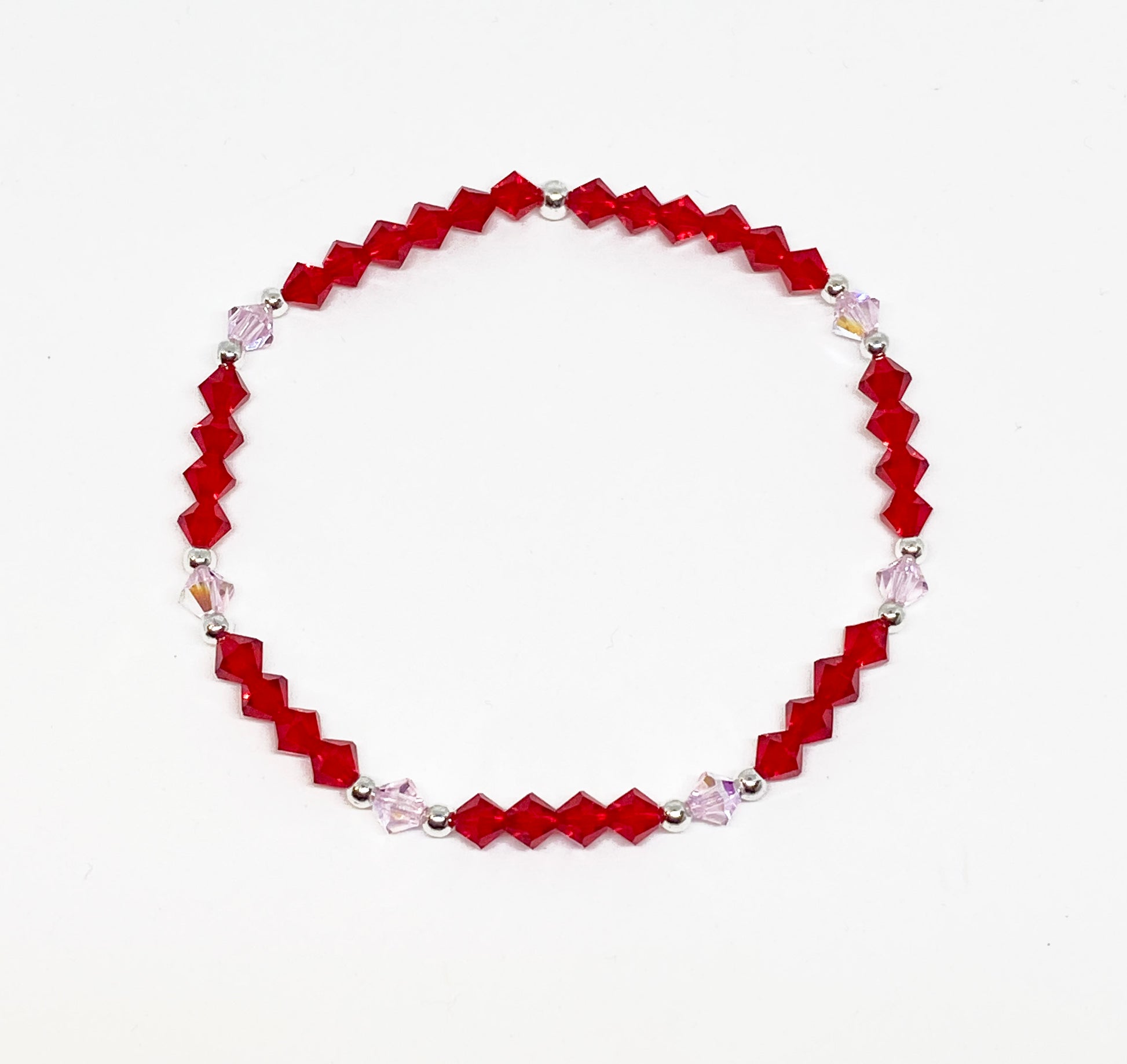 4mm Light Siam and Rosaline AB Swarovski Bicone Crystals alternate with 2.5mm silver plated spacer beads along stretch cording for comfort.