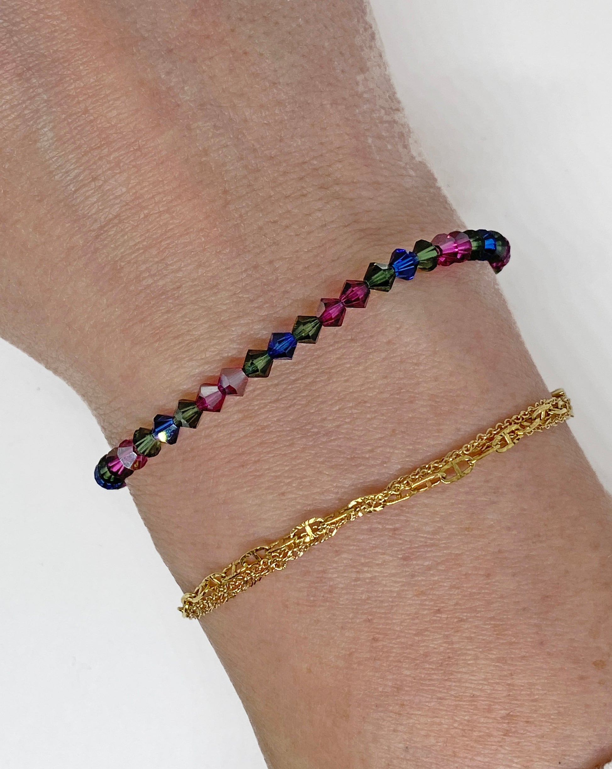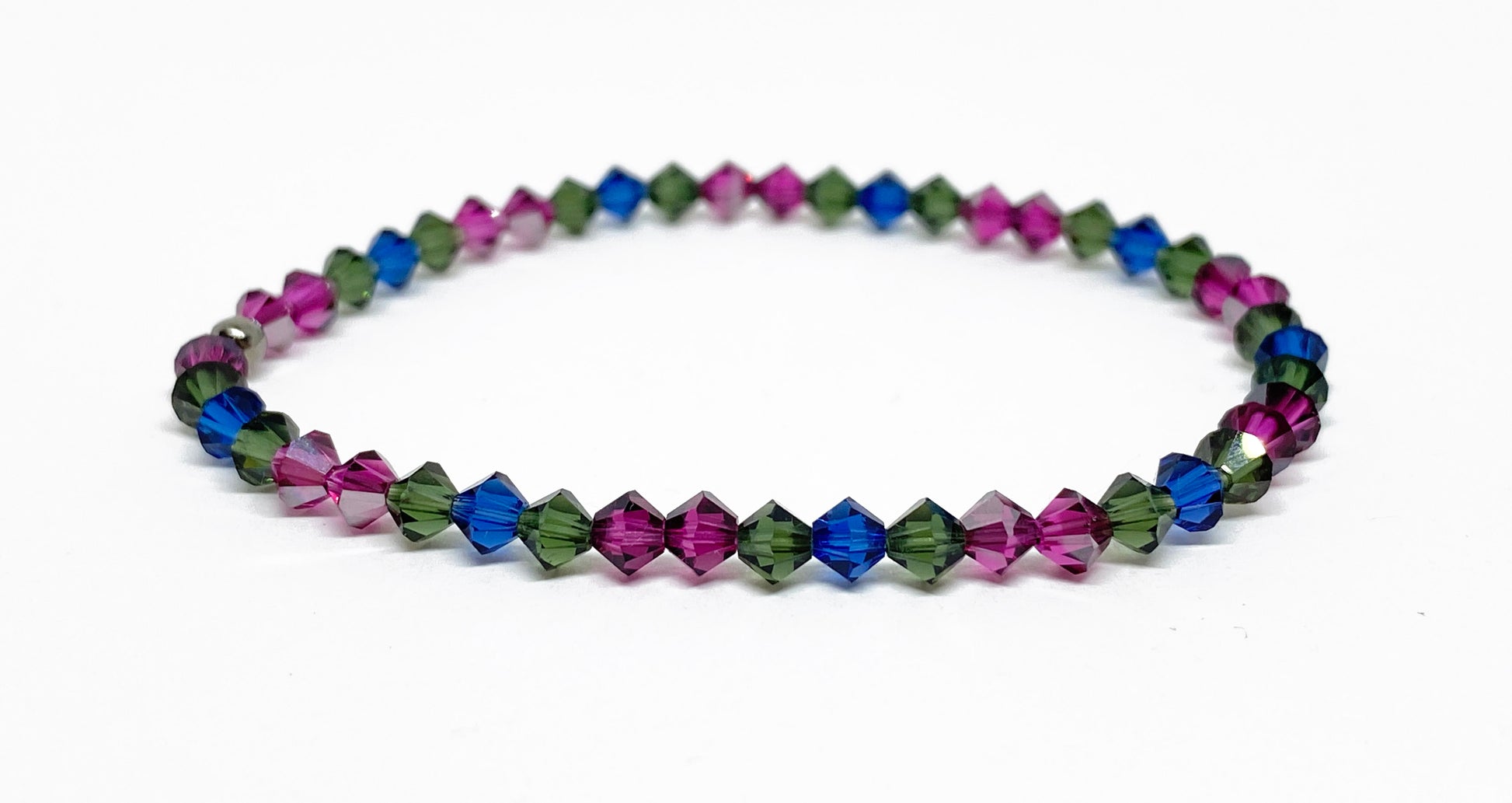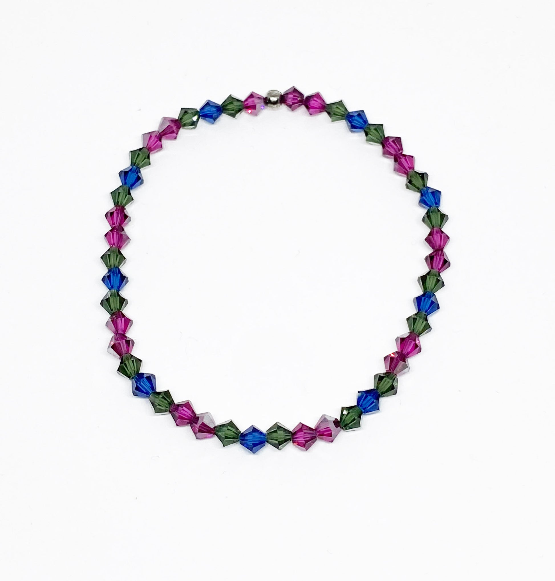 4mm Tourmaline, Fuchsia Satin, and Dark Sapphire Swarovski Crystal bicones alternate along stretch cording for a perfect, deep jewel tone shimmer. This is a stunning piece for fall and winter!