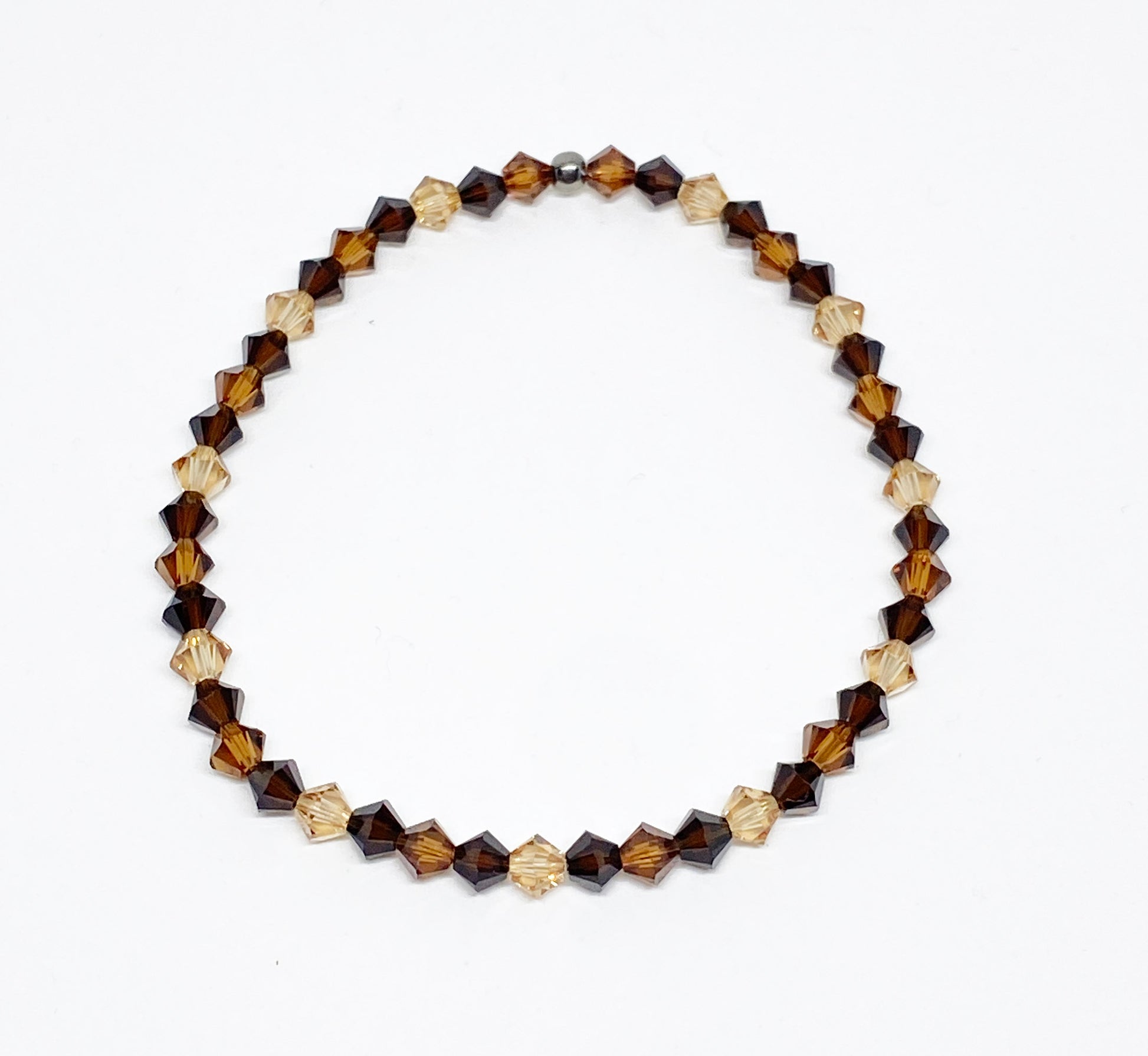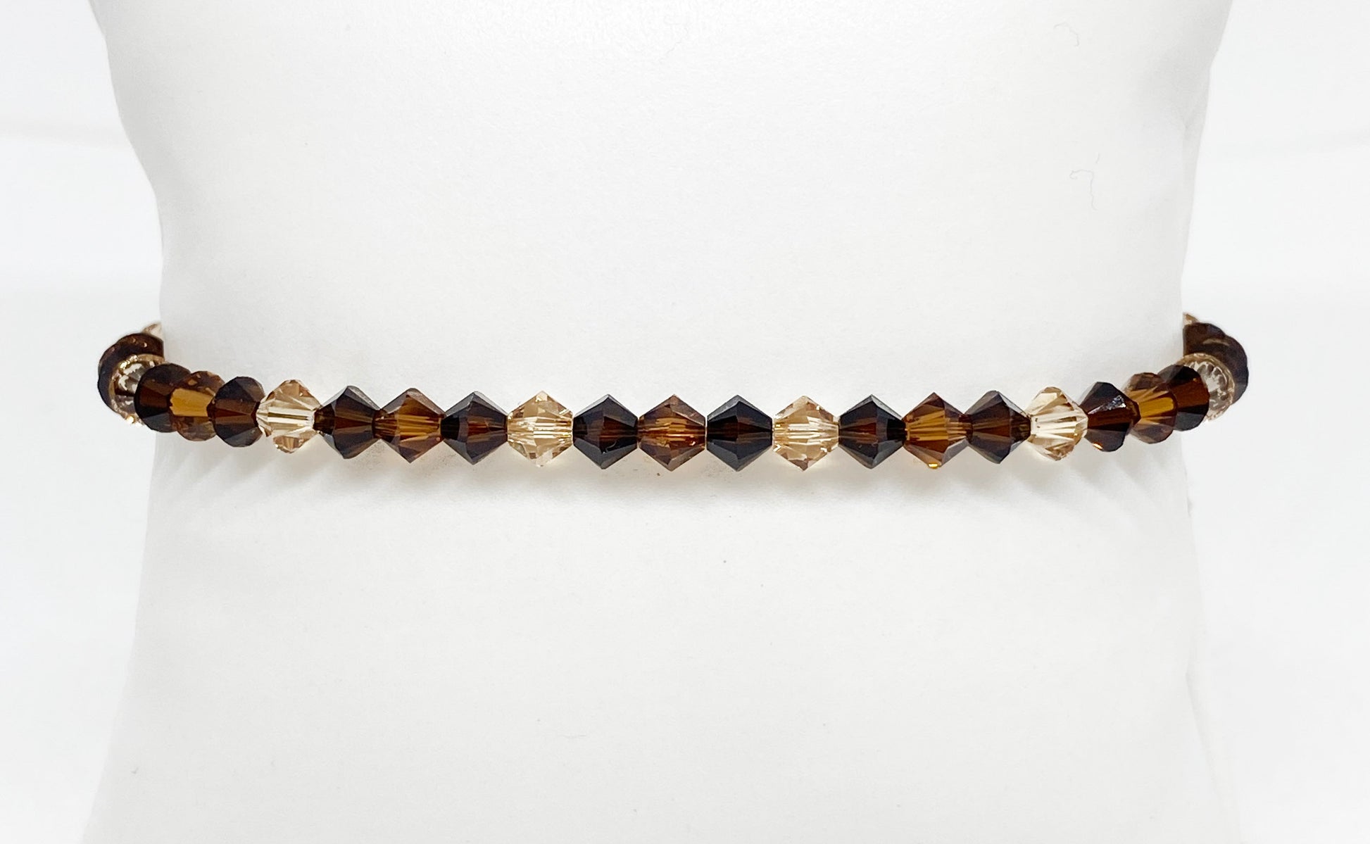 Rich brown Swarovski Crystals are the star of our Mocha Latte Shimmer. 4mm Mocha, Smoked Topaz, and Colorado Topaz Swarovski bicones alternate along stretch cording for the perfect chocolate brown bracelet. Brown is the quintessential color for fall, and pairs beautifully with gold tones.
