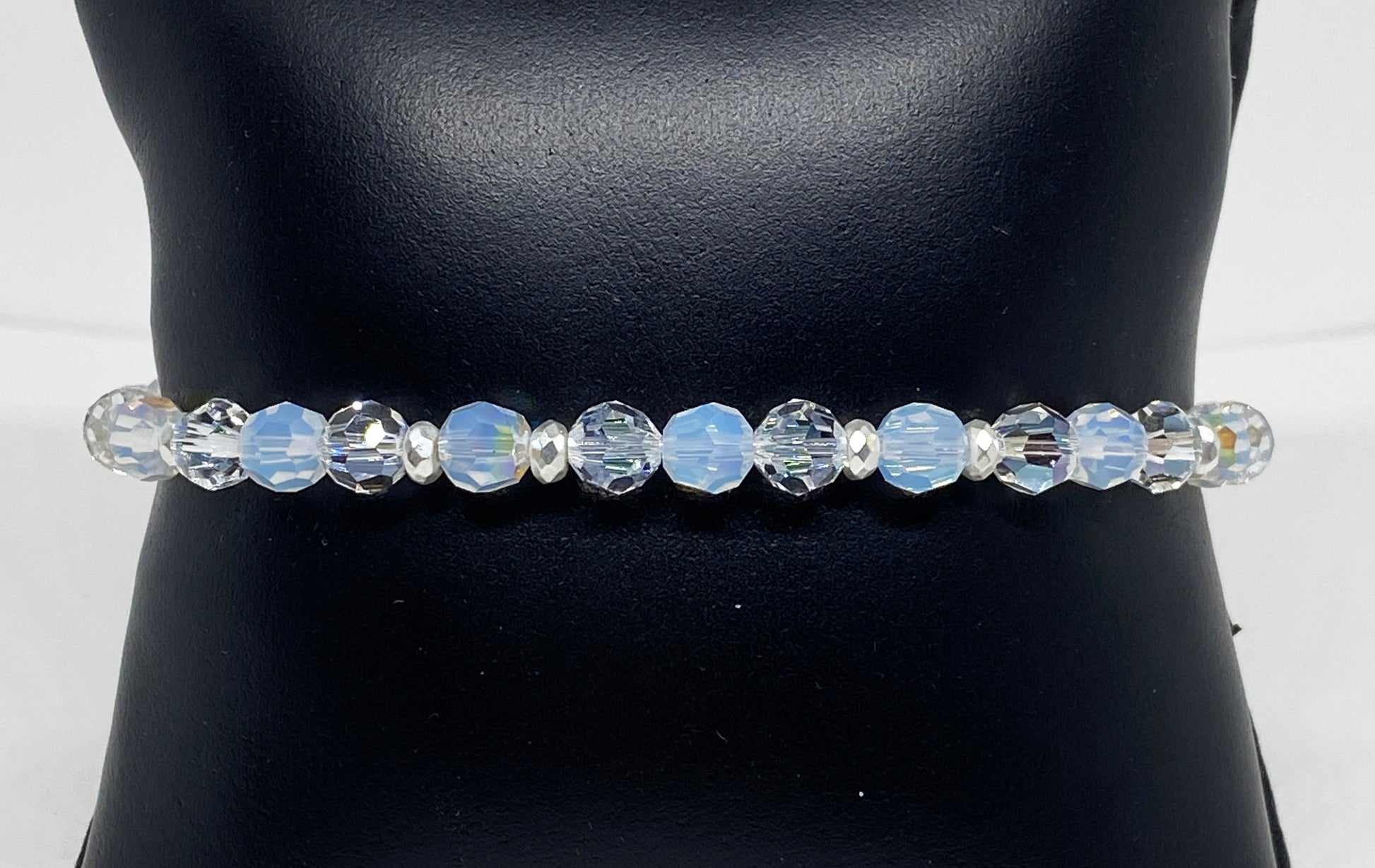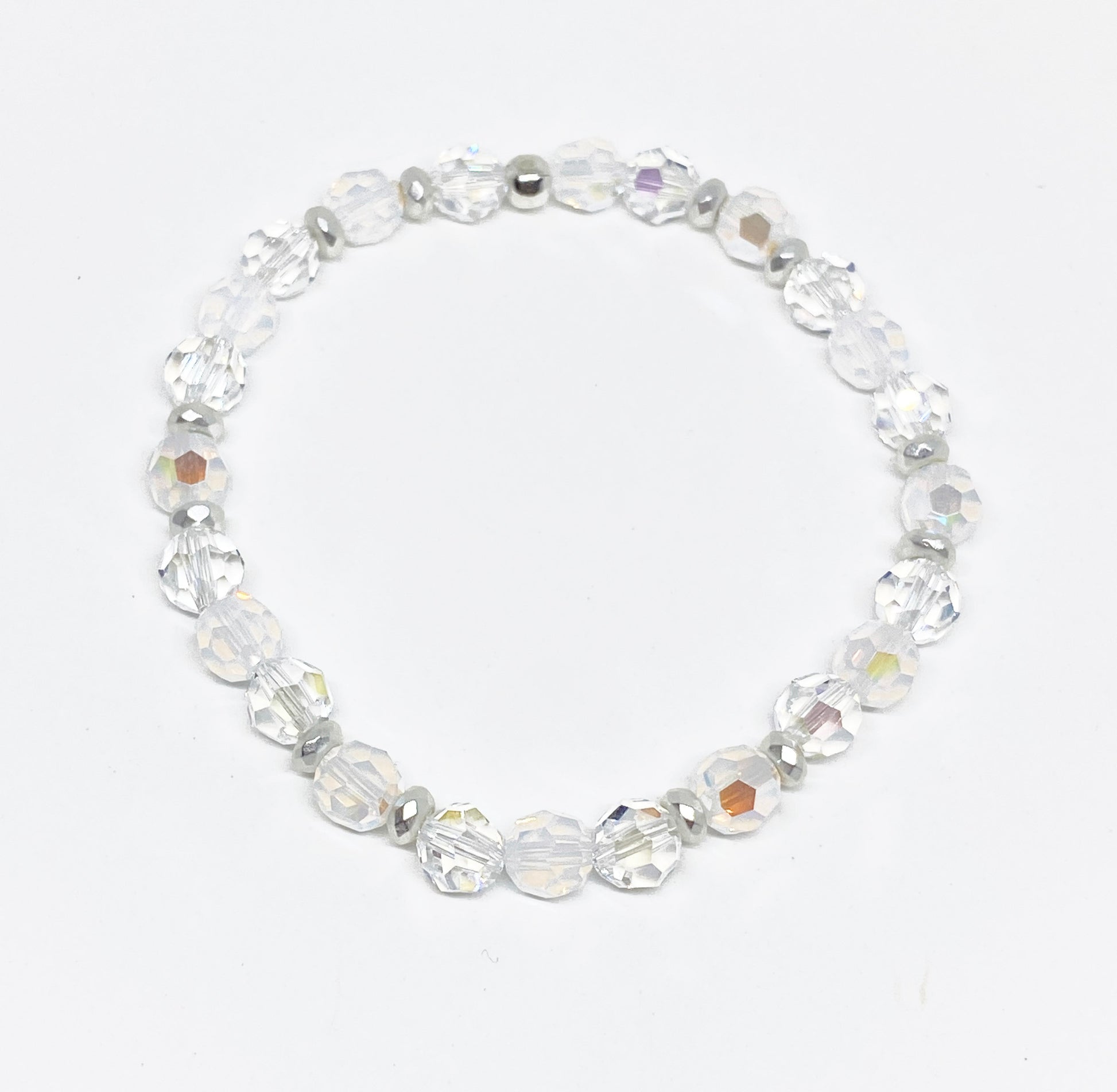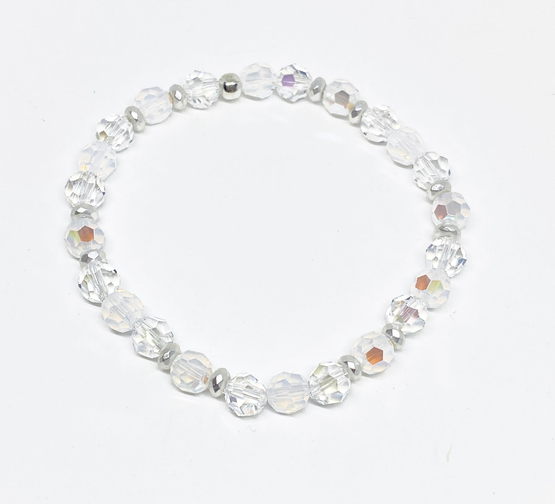 6mm White Opal Shimmer and Crystal Shimmer Swarovski Crystals alternate on stretch cording between silver rondelle spacers for the ultimate holiday piece! The shimmer coating on these crystals reflect a rainbow of light at different angles.